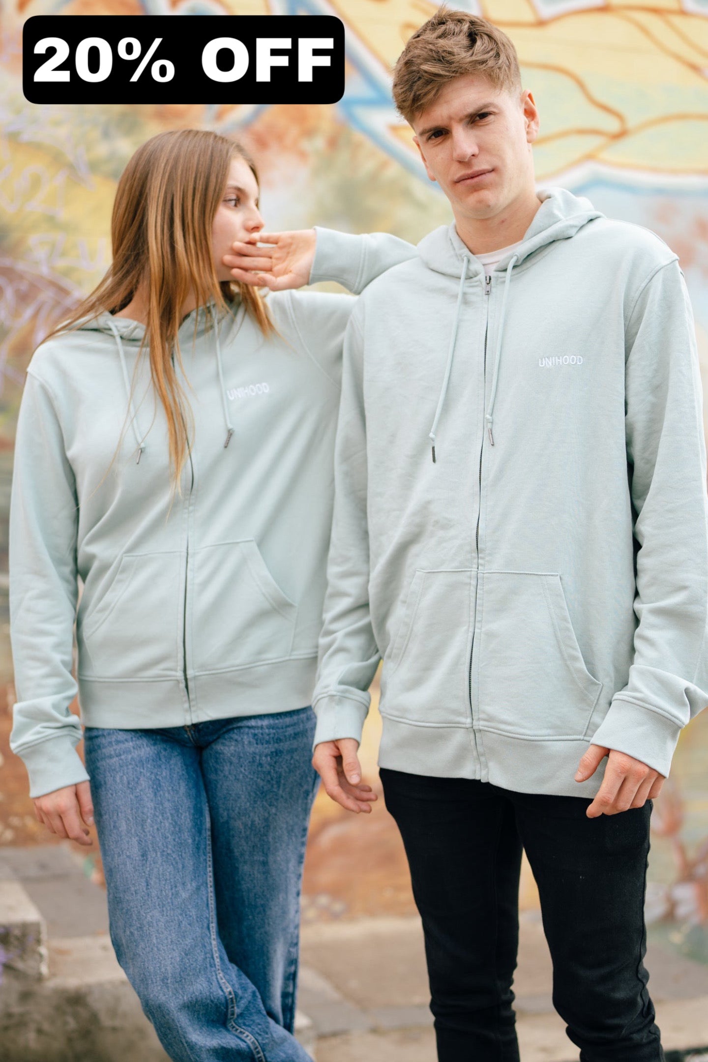 Hoodie de algodón orgánico y poliéster reciclado color menta con cierre. Estampado adelante en la parte izquierda.